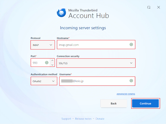 After entering the information, click [Continue].Protocol IMAP Hostname imap.gmail.com Port 993 Connection security SSL/TLS Authentication method Oauth2 Username Username: Your Keio ID (Example: keio-taro@keio.jp).