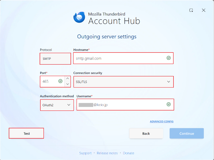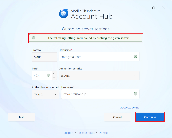After entering the information, click [Test].Protocol SMTP Hostname smtp.gmail.com Port 465 Connection security SSL/TLS Authentication method Oauth2 Username Your Keio ID (Example: keio-taro@keio.jp).
