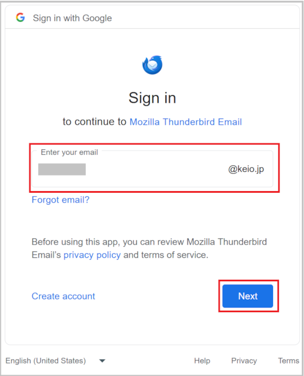 The Google login screen will be displayed. Confirm that your Keio ID (e.g. keio-taro@keio.jp) is entered and click [Next].