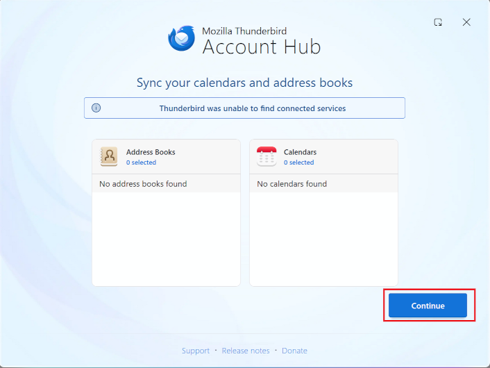 The "Sync your calendars and address books" screen will appear. Click [Continue].