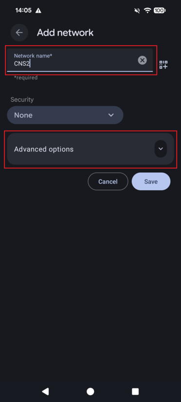 On the [Add network] screen, enter [CNS2] in the [Network name*] field, and then tap [Advanced options].