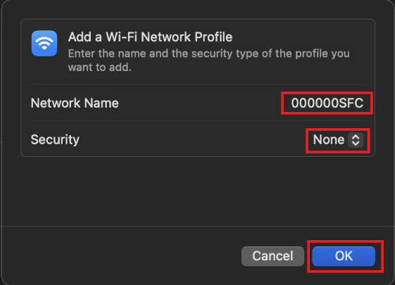 - Select Network Name: [000000SFC], Security: [None], and click [OK].