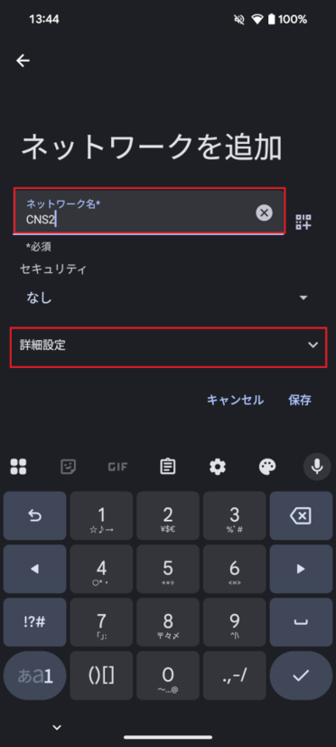 「ネットワークを追加」画面で「ネットワーク名」の欄に「CNS2」と入力した後、「詳細設定」をタップします