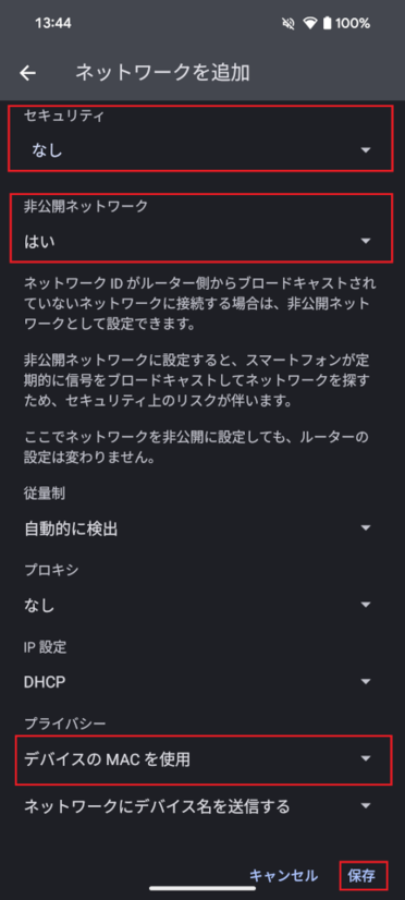 「非公開ネットワーク」 : 「はい」を選択する