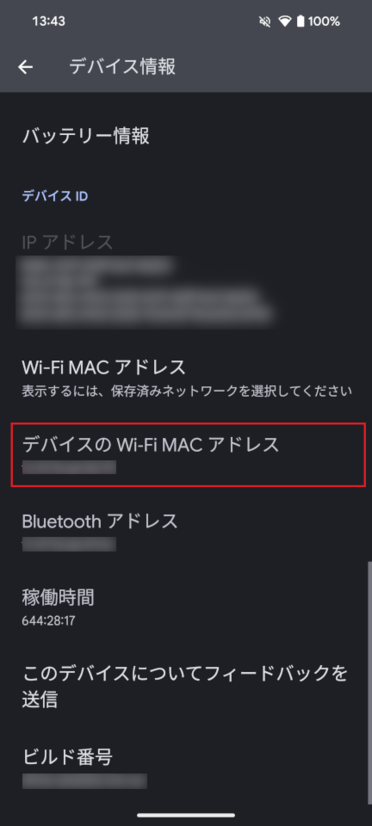 「デバイス情報」画面下部にある、「デバイスの Wi-Fi MAC アドレス」下部に記載されている英数字がMACアドレスです。
