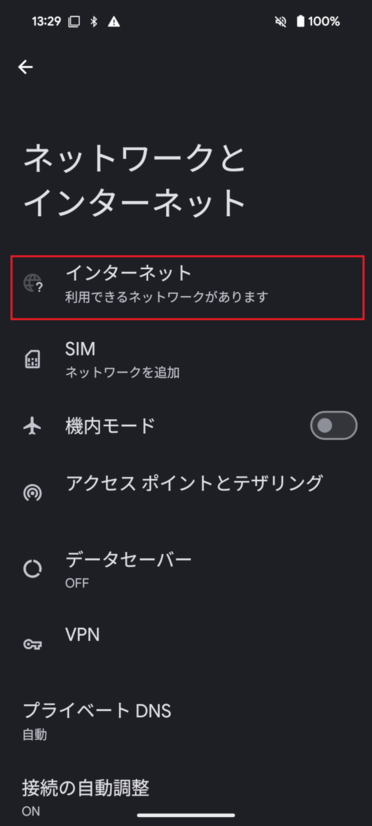 「ネットワークとインターネット」画面で「インターネット」をタップします
