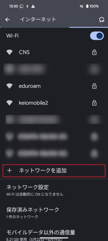 「インターネット」画面下部にある、「ネットワークを追加」をタップします