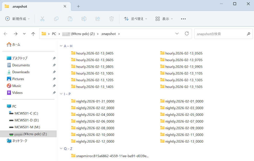 いずれの環境でも、ディレクトリ ".snapshot" を使用することができますが、CNSのWindows環境およびMac環境では ".snapshot" を容易に参照できるよう、ショートカットやシンボリックリンクを用意していますので、GUI操作のみで参照できます。