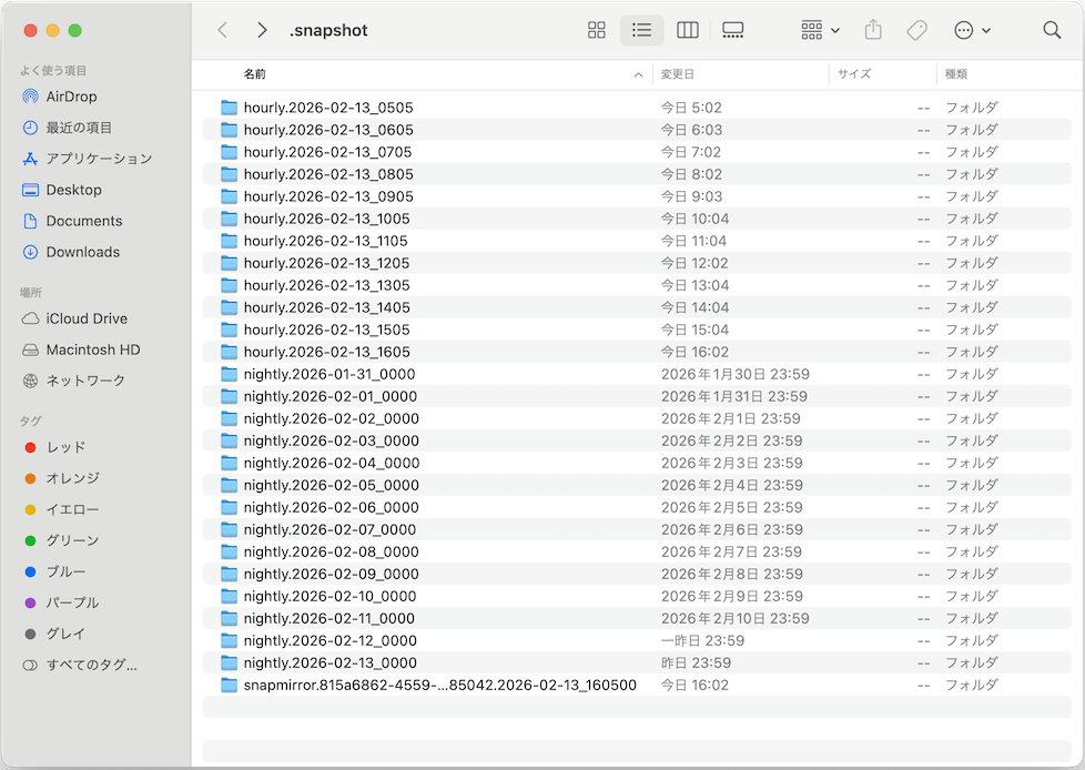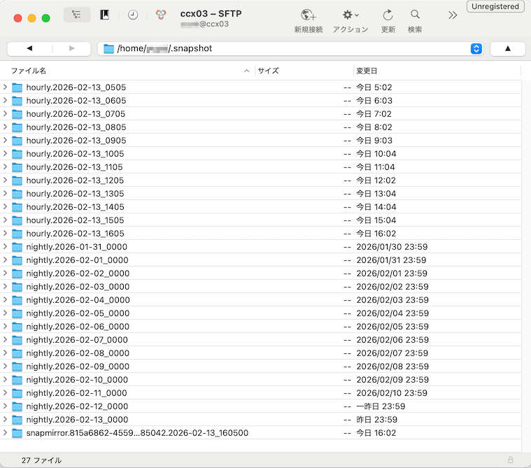- 日時形式(nightlyまたはhourly.年-月-日_時間)のディレクトリ名がその日時のスナップショットです。参照したい日時のディレクトリをクリックして開いてください。