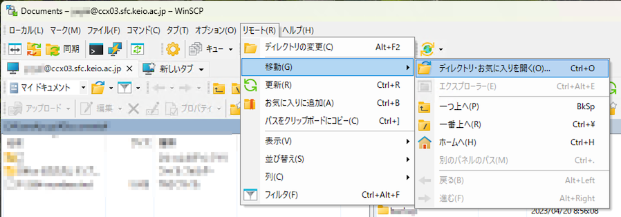 - [リモート]-[移動]-[ディレクトリ・お気に入りを開く]を選びます。