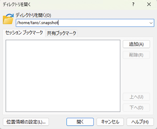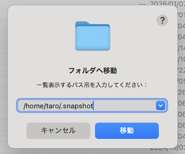 (入力の形式) /home/ログイン名/.snapshot (ログイン名がtaroの場合の例) /home/taro/.snapshot