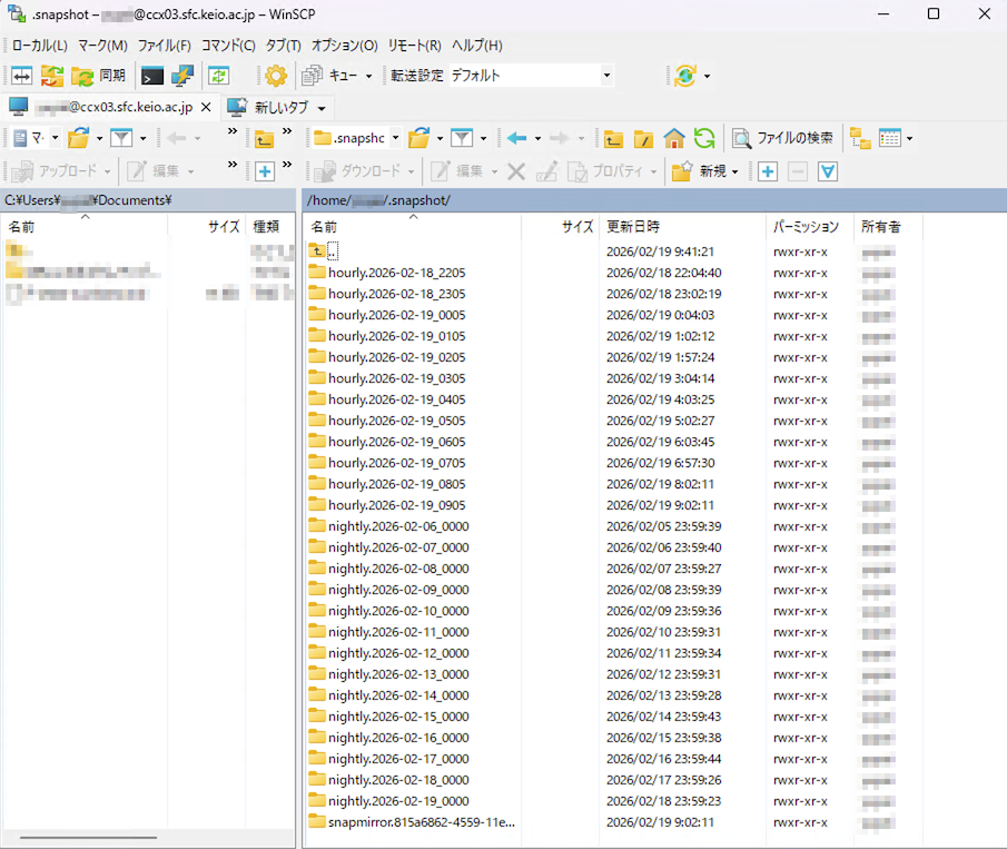 CNSのホームディレクトリでは、スナップショットにより自動的に毎日0時の時点での状態が保管され、最大2週間前まで参照できます。また1時間毎のスナップショットもあり、こちらは最大12時間前まで参照できます。